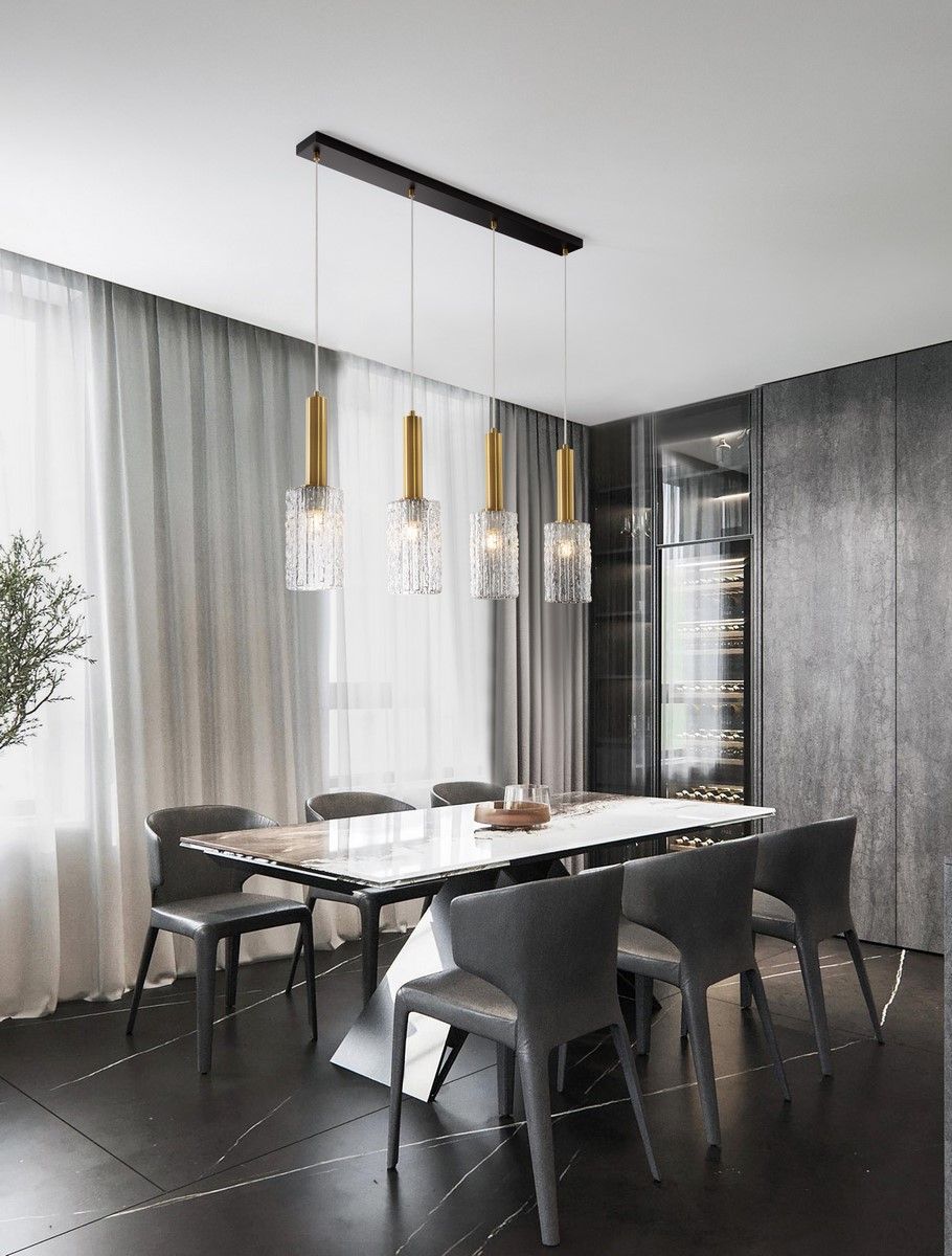 La lámpara colgante CERTA 9009275 es una luminaria de diseño elegante que combina acabados en dorado y negro con cristal transparente, perfecta para interiores modernos y sofisticados. Esta lámpara cuenta con cuatro portalámparas para bombillas E27 (no incluidas) de hasta 12W cada una, operando con un voltaje de 230V. Sus dimensiones son 97 cm de largo, 13 cm de ancho y 120 cm de altura, lo que la convierte en una opción ideal para instalar sobre mesas de comedor, islas de cocina o barras. Con un índice de protección IP20, es adecuada para uso en interiores, aportando estilo y una iluminación equilibrada en cualquier ambiente.