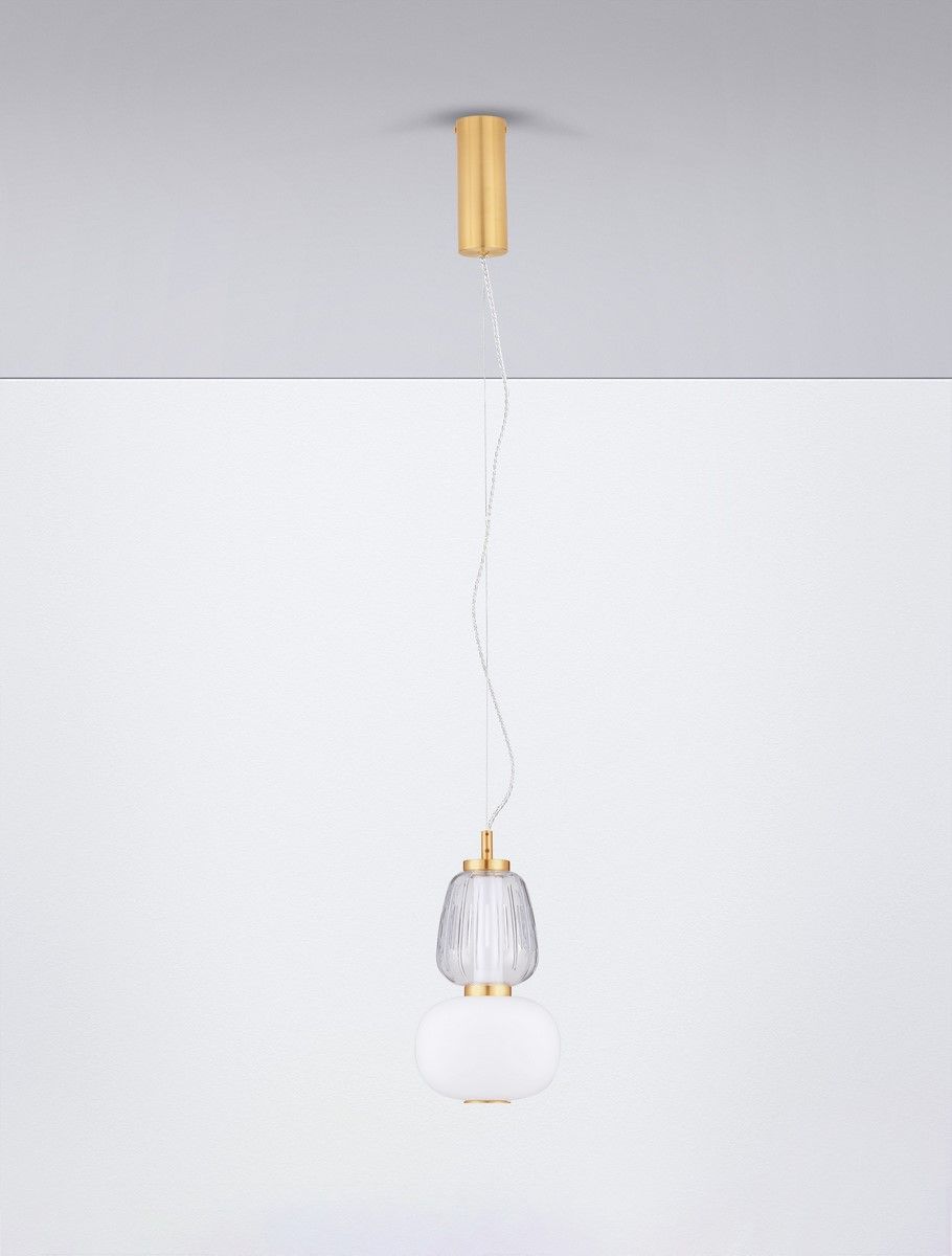 La lámpara colgante MOVIL 9030538 combina vidrio transparente y opalino con detalles dorados, ofreciendo un diseño moderno y sofisticado. Con una potencia de 18W, 230V y luz cálida de 3000K, es ideal para interiores elegantes. Sus dimensiones son 17 cm de diámetro y 120 cm de altura, con protección IP20. Perfecta para añadir un toque de lujo en comedores, salas o dormitorios.