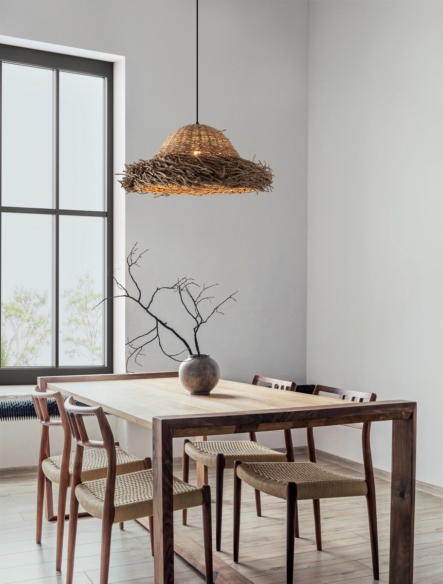 La lámpara colgante NATU 9586515 presenta un diseño natural y elegante, combinando fibras de pasto marino (seagrass) con un acabado en tela negra. Esta luminaria funciona con tres bombillas E27 (no incluidas) de hasta 12W cada una, operando con un voltaje de 230V. Con un diámetro de 65 cm y una altura ajustable entre 28 cm (H1) y 200 cm (H2), es ideal para crear un ambiente acogedor y decorativo en interiores como comedores, salas de estar o áreas sociales. Con un índice de protección IP20, es adecuada para uso en interiores, aportando un toque natural y contemporáneo a cualquier espacio.
