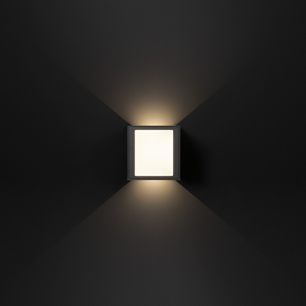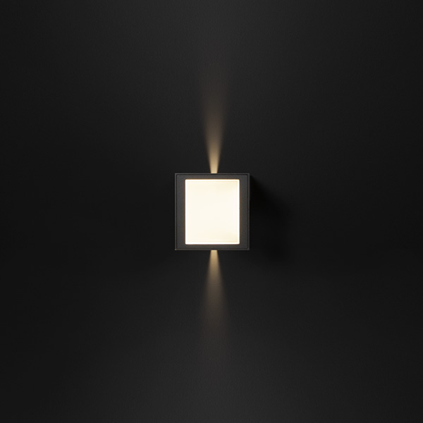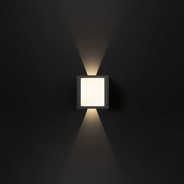 Oslo es un aplique LED de exterior diseñado para iluminación arquitectónica con efecto Up & Down ajustable. Permite modificar el ángulo de apertura de la luz entre 0° y 100°, creando diferentes efectos luminosos sobre fachadas y muros.