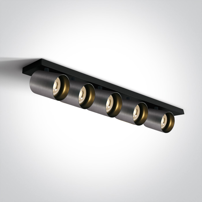 Plafón retro de superficie con 5 spots ajustables GU10. Disponible en acabados gris metalizado, blanco, negro/latón cepillado y negro. Ideal para iluminación interior decorativa.