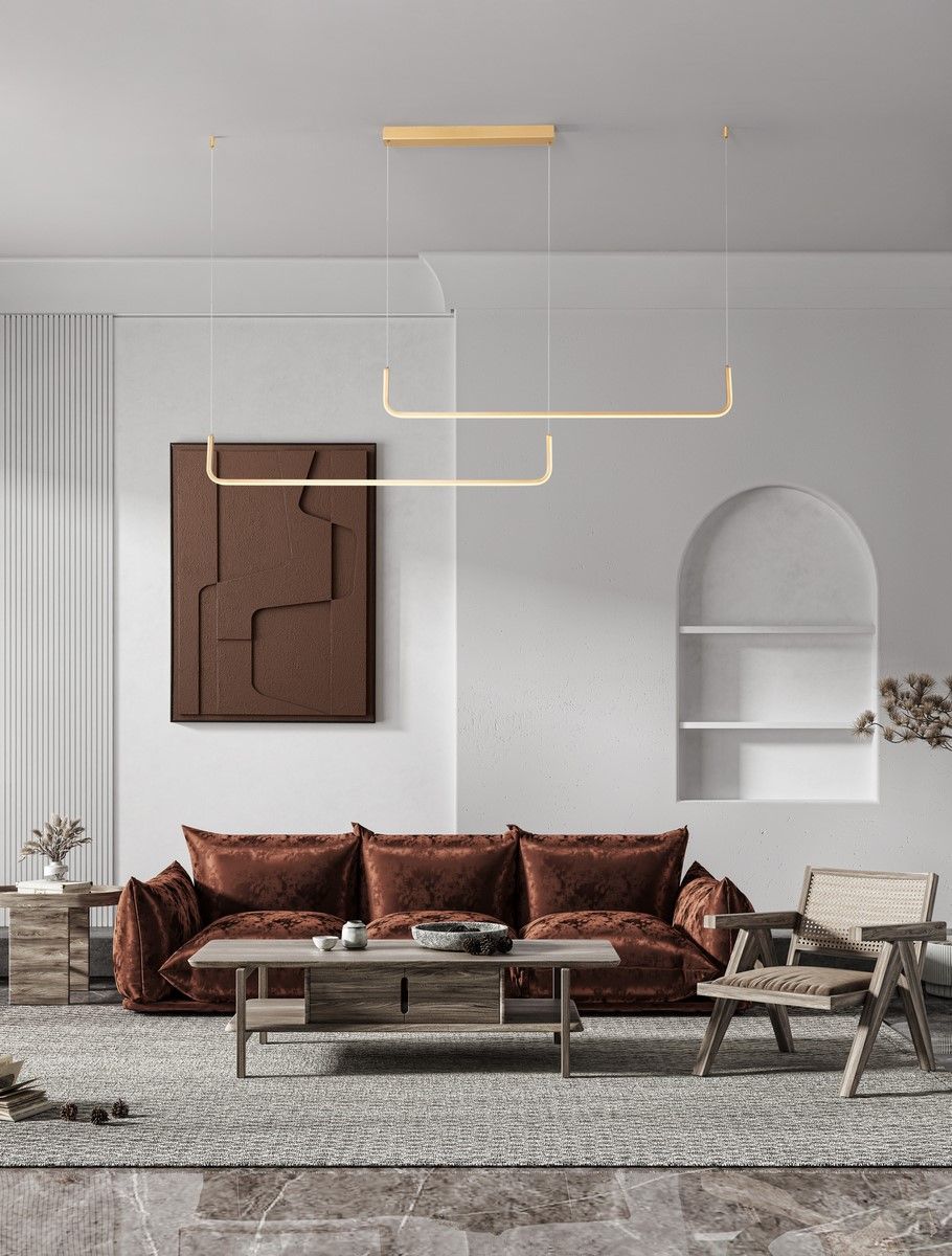 La lámpara colgante STRITA 9006089 en acabado dorado cepillado (Brush Gold) y fabricada en aluminio, es una luminaria impactante y sofisticada que se destaca en cualquier espacio moderno. Con una impresionante potencia de 410W, voltaje de 230V y luz cálida de 3000K, esta lámpara ofrece una iluminación potente y envolvente, ideal para grandes áreas. Está equipada con un sistema de regulación mediante TRIAC, permitiendo ajustar la intensidad de la luz para crear el ambiente perfecto. Sus dimensiones son 150 cm de largo y 120 cm de altura, lo que la convierte en una opción ideal para comedores amplios, salones o espacios comerciales. Con un índice de protección IP20, es adecuada para uso en interiores, aportando tanto funcionalidad como un estilo lujoso y contemporáneo.